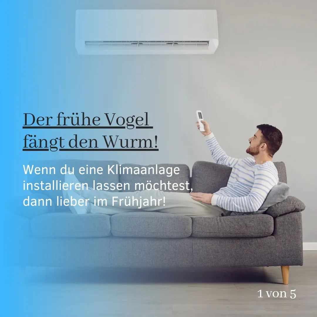 Der frühe Vogel fängt den Wurm! " Warum?" - fragt ihr. Und das ist eine gute Frage, auf die ich gerne antworten möchte. Für uns, Kälteanlagenbauer, Sommer ist die heißeste Zeit im Jahr und ich meine jetzt nicht die Temperaturen, die die letzten Jahren steigen, ich meine die Arbeit. Dem Sommer entgegen ist es im Frühjahr in unserer Branche ruhiger. Oft ist es so, dass man an eine Klimaanlage denkt, wenn es im Schlafzimmer +25° ist und eine Abkühlung in der Nacht ist nicht mehr im Sicht. Man möchte auch eine schnelle Lösung des Problems. Man ruft eine Kältefirma an und stellt fest, dass sie leider nächste paar Wochen keine Zeit haben. Und im besten Fall wird es was in 4 Wochen. Und nicht nur die langen Wartezeit im Hochsommer soll dich überzeugen, eine Klimaanlage im Frühjahr installieren zu lassen. Der Preis ist der andere Aspekt. Jedes Jahr steigen die Preise auf Material und es passiert 1 mal im Jahr. Zum Beispiel, bei unserem Lieferanten werden die Preise im April erhöht. Und wenn man schon das Vorhaben hat, eine Klimaanlage installieren zu lassen, warum dann nicht gleich im Frühjahr. So sparst du Geld und bist für den heißen Sommer vorbereitet.